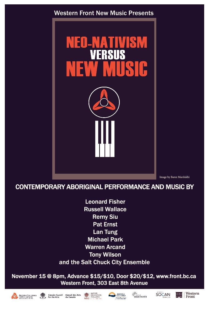 Their original ensemble name appeared again between the decades, at the same venue: 2014's Neo-Nativism Versus New Music. Alex Varty, writing for the Georgia Straight ahead of that show, called the original group "a landmark fusion of aboriginal music, video, and performance art." Wallace talked to Varty then about his ambivalence around the brand name, which he still felt when talking with me this week.
