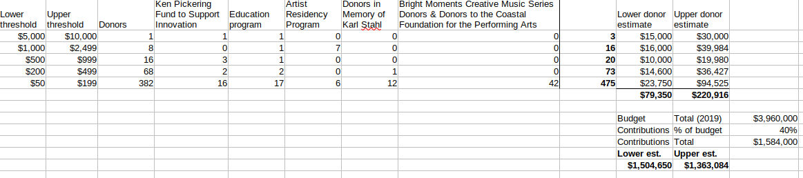 Helpfully, the report lists all individual donors, grouped up into price tiers. I counted them up on a sheet: